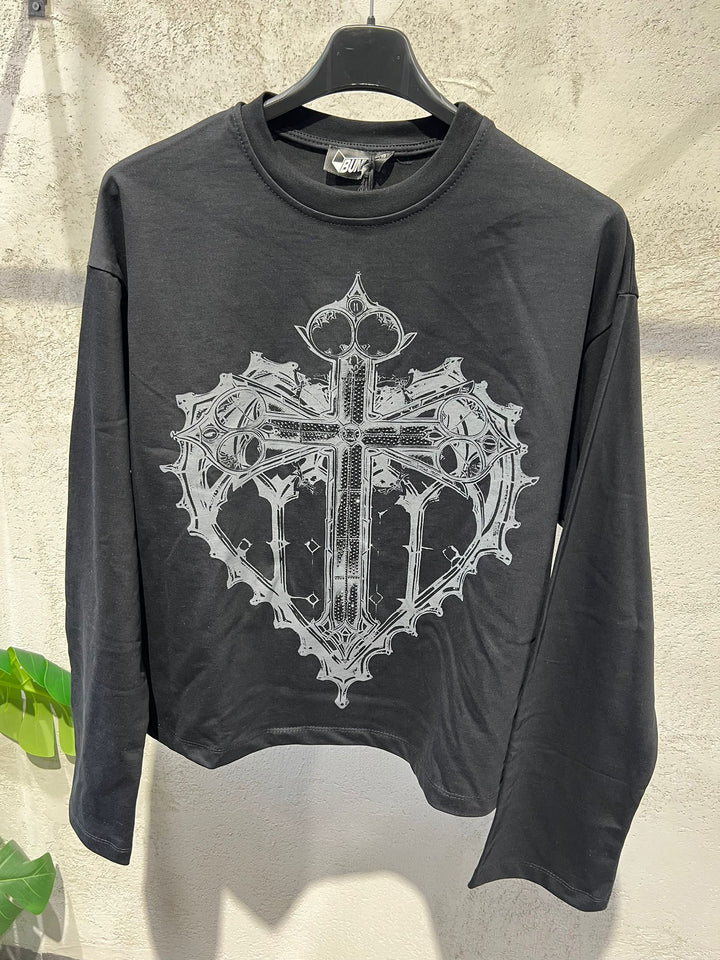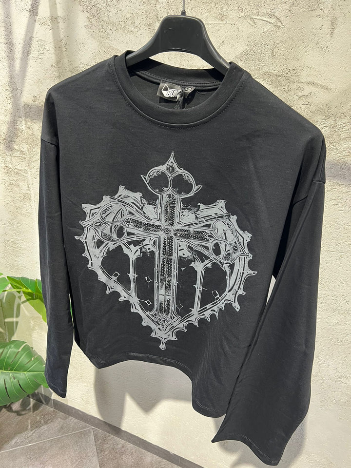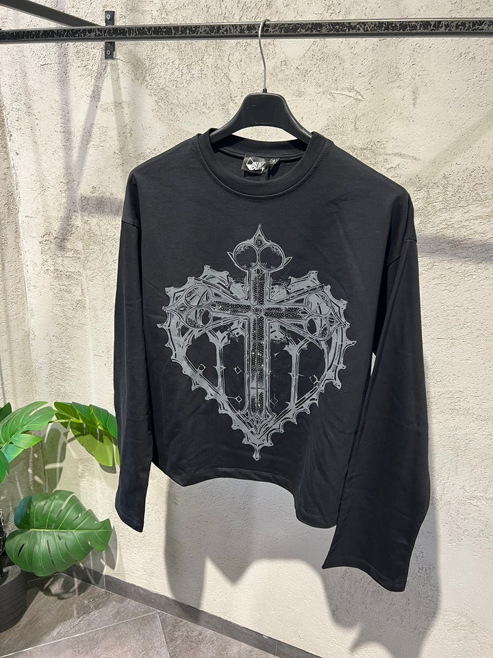 T-SHIRT STAMPA CUORE STRASS LONG SLEEVE , TESSUTO COTONE DOPPIO , VESTIBILITA' CROPPED OVERSIZE